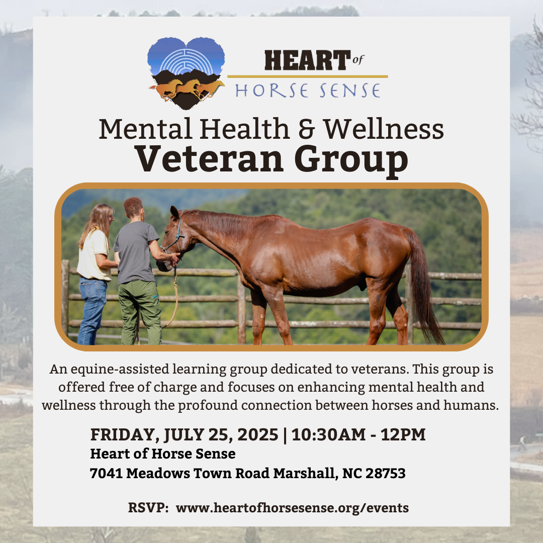 Veteran Mental Health & Wellness Group Friday, July 25, 2025 10:30 AM 12:00 PM Heart of Horse Sense 7041 Meadows Town Road Marshall, NC, 28753 United States (map) Google Calendar ICS An equine-assisted learning group dedicated to veterans. This group is offered free of charge and focuses on enhancing mental health and wellness through the profound connection between horses and humans.RSVP Below!